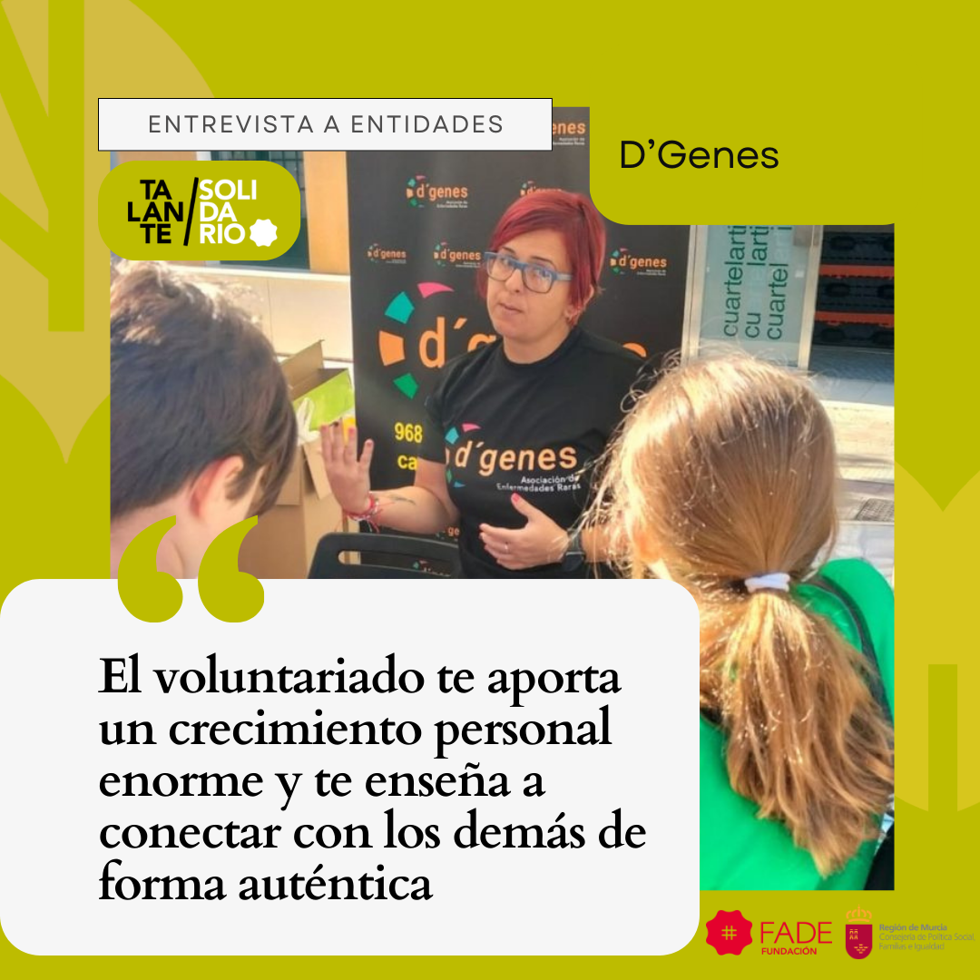 En D’Genes trabajan con un objetivo muy claro: mejorar la calidad de vida de las personas con enfermedades raras, sin diagnóstico y/o discapacidad, así como la de sus familias. Lo hacen a través de apoyo integral, acompañamiento, sensibilización y defensa de derechos. Los voluntarios son parte activa de esta misión, colaborando en acompañamiento, ocio inclusivo, sensibilización y apoyo directo a las familias. Como dice María Ángeles, “los voluntarios permiten que lleguemos a más familias y que nuestro impacto sea más humano y cercano”, así nos los cuenta su responsable del voluntariado dentro de la entidad, Mª Ángeles Carrión.
